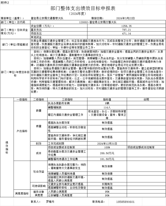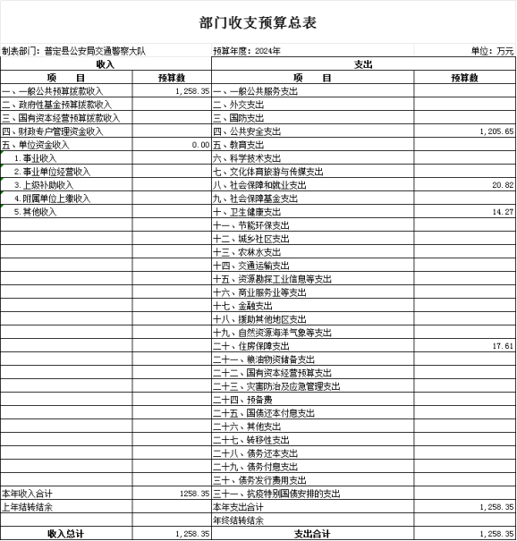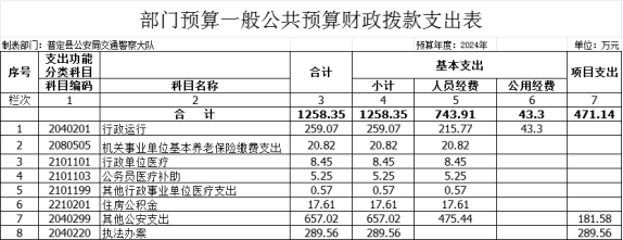 普定县公安局交通警察大队2024年度收支预算总计1258.35万元,与2023年相比,减少13.48万元,降低1.06 %。主要原因是:厉行节约,压缩经费支出。