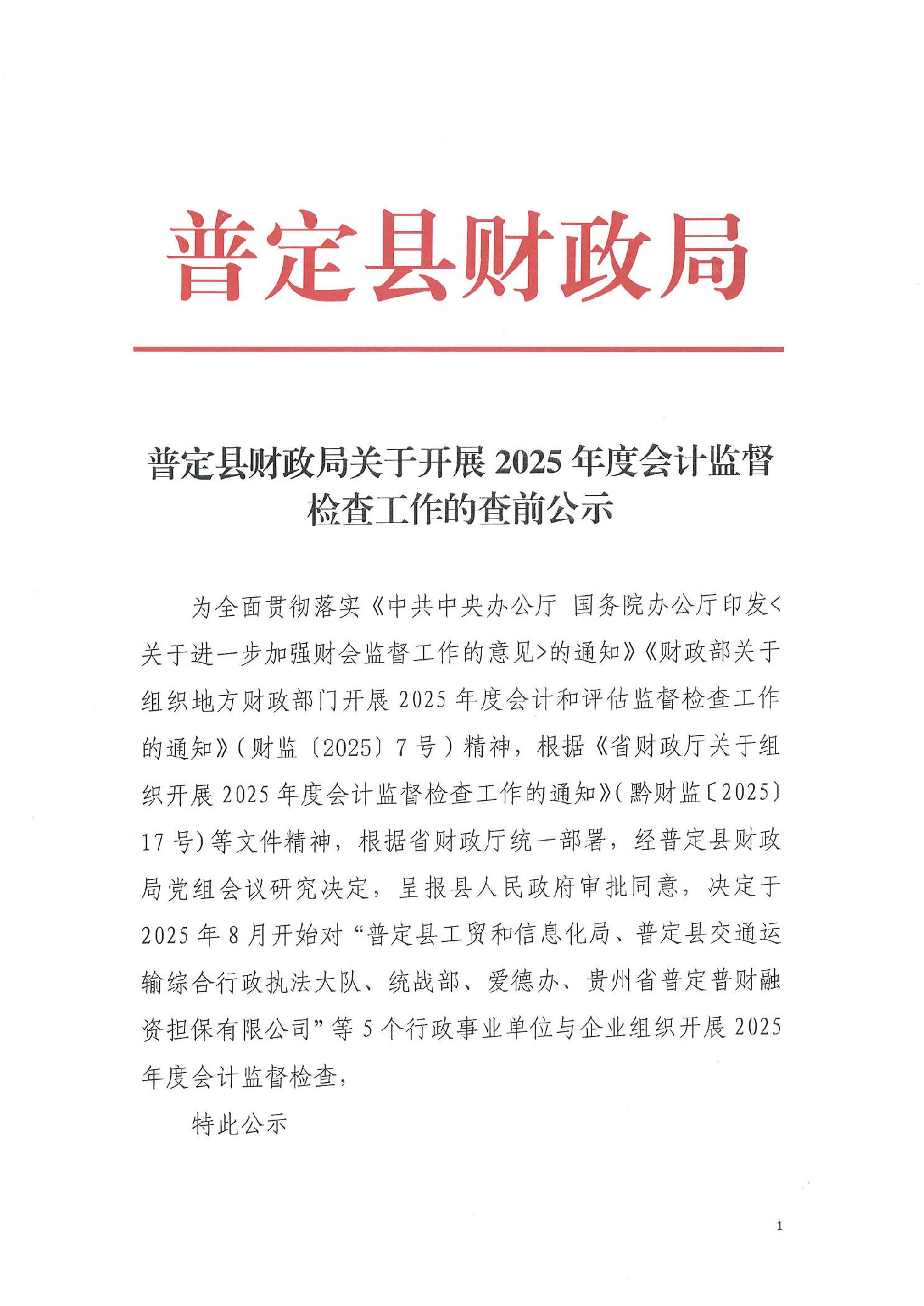 普定县财政局关于开展2025年度会计监督检查工作的查前公示